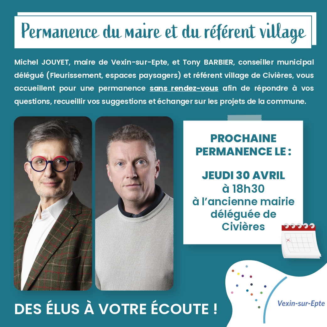 Vous souhaitez effectuer une demande sur un projet ou partager vos idées pour la commune ? Ce jeudi 30 avril, Michel JOUYET, maire de Vexin-sur-Epte, et Tony BARBIER, conseiller municipal