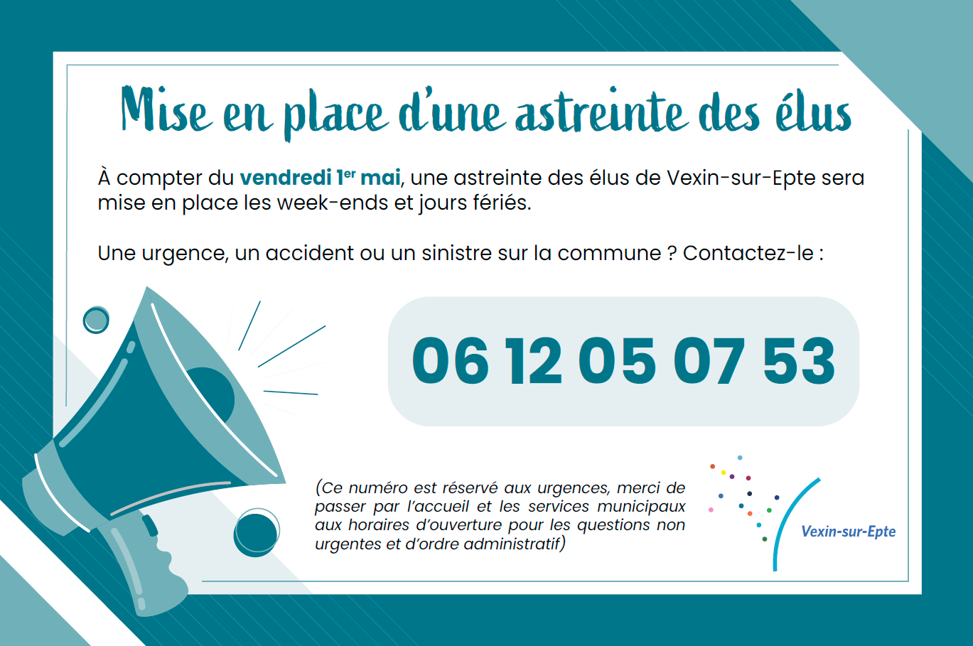 Nouveauté ! À compter du vendredi 1er mai, une astreinte des élus de Vexin-sur-Epte sera mise en place les week-ends et jours fériés. Une urgence, un accident ou un