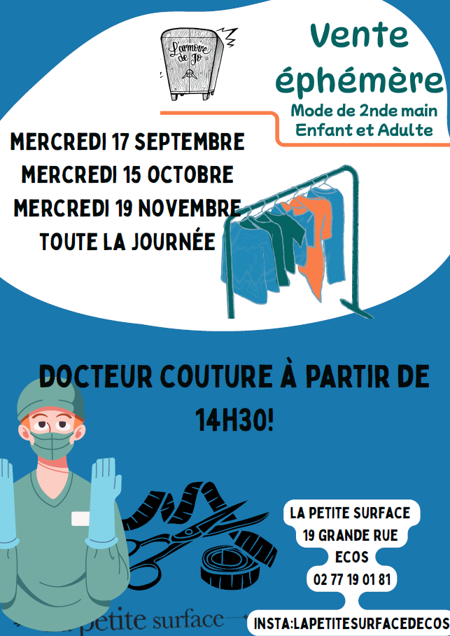Mercredi 19 novembre Toute la journée Docteur couture à partir de 14h30 à La Petite Surface d'Écos (19 Grande Rue) La Petite Surface vous convie à sa vente éphémère spécialisée dans la mode de seconde main pour enfant et adulte. Pour plus d'informations : 02 77 19 01 81 insta : lapetitesurfacedecos