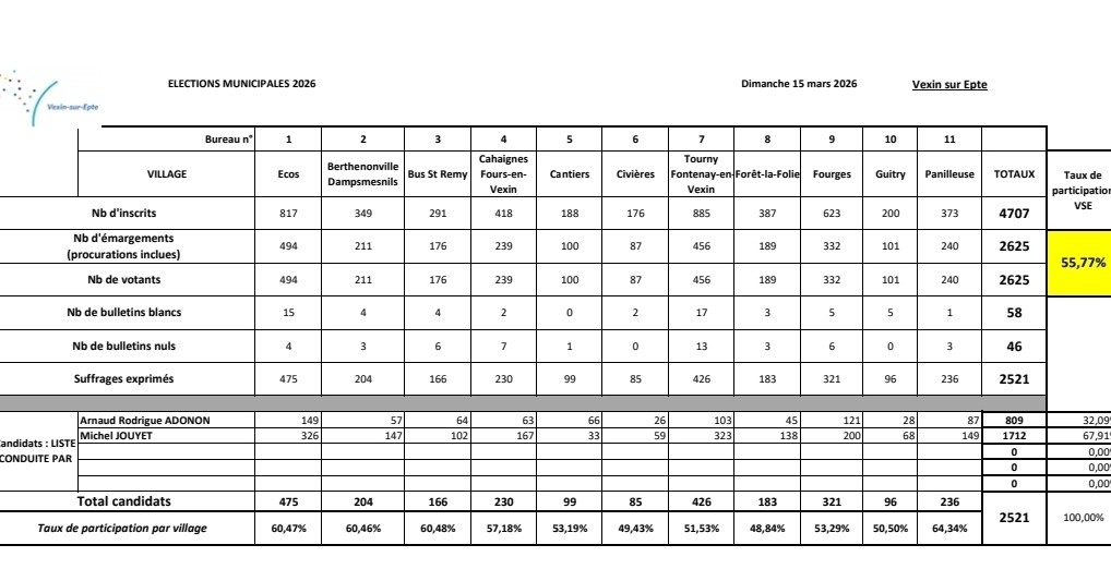À l’issue des élections municipales organisées le dimanche 15 mars 2026, la liste « Vexin-sur-Epte, un avenir en commun », conduite par Monsieur Michel Jouyet, est arrivée en tête.