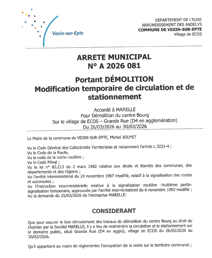 Afin d’assurer le bon déroulement des travaux de démolition dans le centre-bourg d’Écos, une restriction de circulation ainsi qu’une interdiction de stationnement seront mises en place du jeudi 26