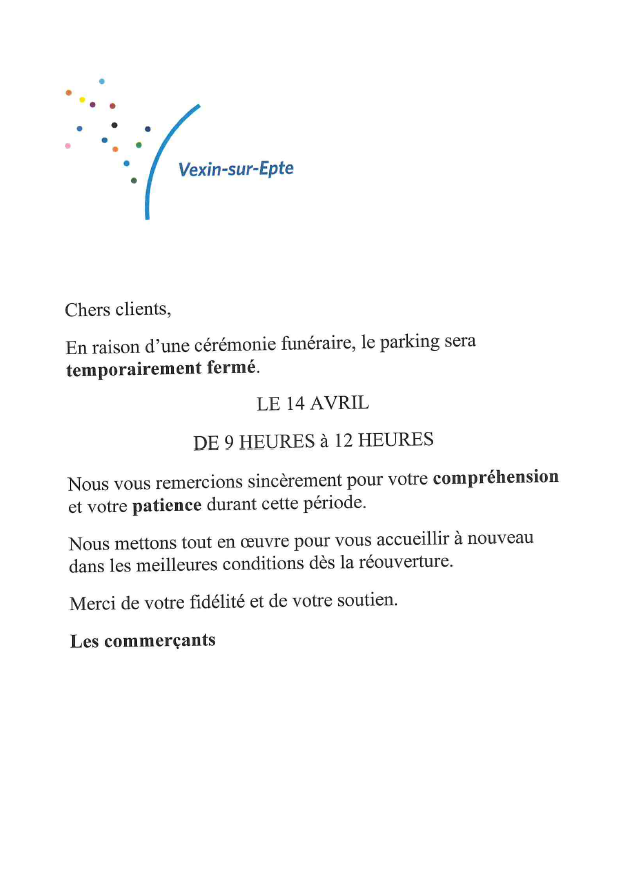 En raison d’une cérémonie funéraire, le parking situé sur la Place du village de Fourges sera temporairement fermé le mardi 14 avril de 9h à 12h. Nous vous remercions