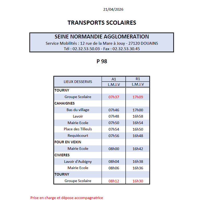 Suite à l’ajout d’un nouvel arrêt intitulé « Place des Tilleuls » sur le village de Cahaignes, les horaires de la ligne de transport scolaire P98 ont été modifiés.